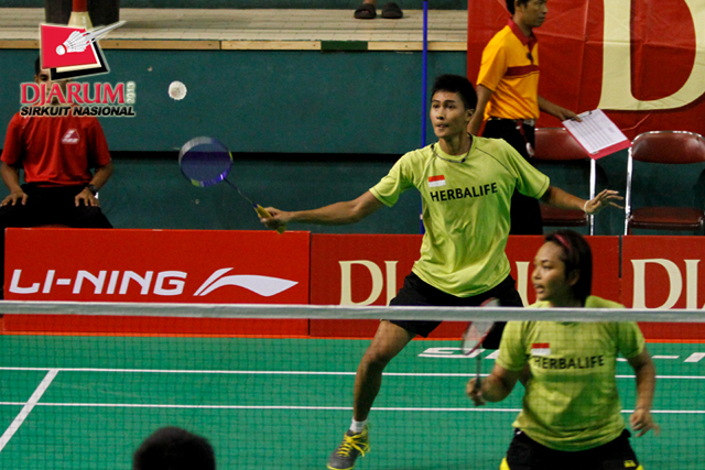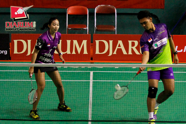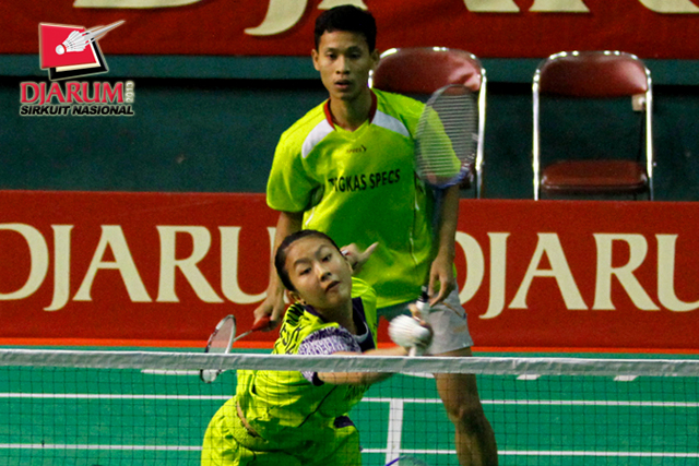 Rahmat Adianto/Nurbeta Kwanrico (DJARUM) berusaha menyambar pengembalian tanggung
