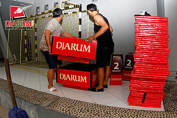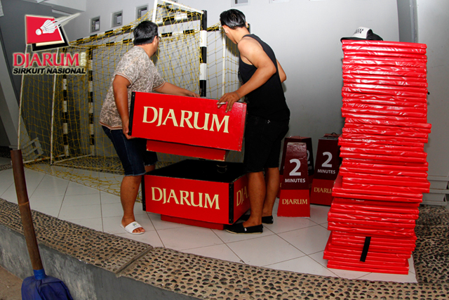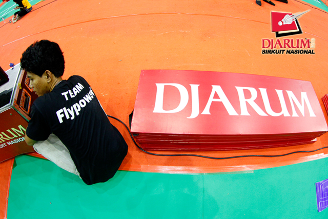 Salah satu pekerja siap memasangkan adboard Djarum di pinggir lapangan pertandingan.