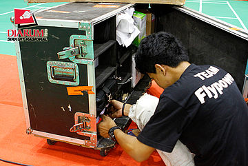 Dua pekerja sedang menggotong tempat penyimpanan raket yang akan diletakkan di pinggir lapangan pertandingan.