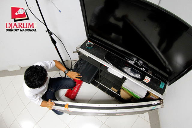 Backdrop Djarum Sirkuit Nasional Li-Ning Yogyakarta Open 2013 siap dipasang di pintu masuk GOR Among Raga.