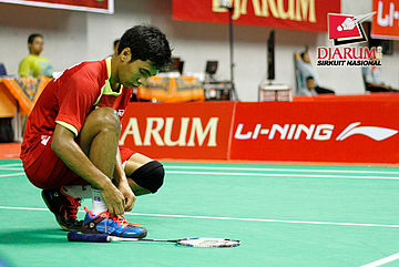 Alamsyah Yunus (Pertamina Indonesia) mengikat tali sepatunya sebelum memulai pertandingan.