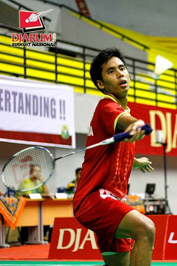 Alamsyah Yunus (Pertamina Indonesia) bersiap mengembalikan shuttlecock ke arah I Made Asti (Jaya Agung Magelang).