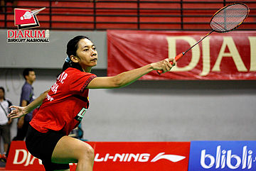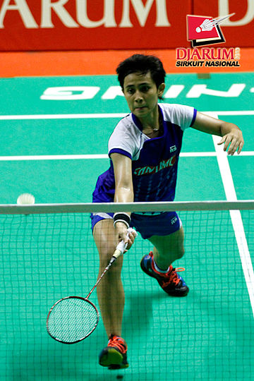 Rosaria Yusfin (PB Djarum) mengembalikan shuttlecock ke arah Rina Andriani (Suluh).