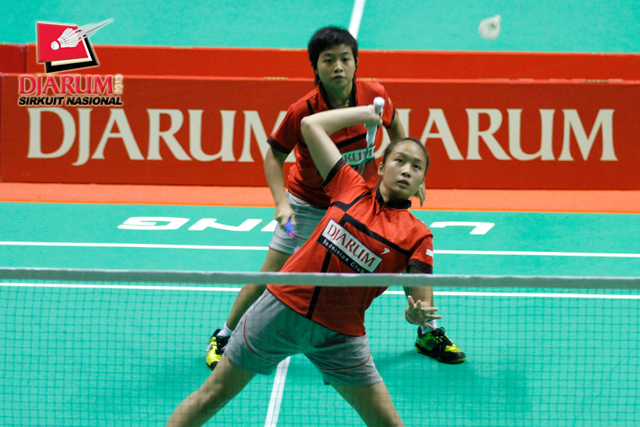 Cynthua Shara/Felicia Parmenas (PB Djarum) bersiap menyambar pengembalian tanggung dari Deha/Liony Citra (Bintang Utama).