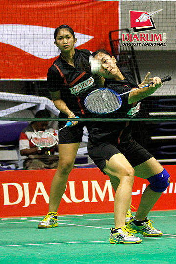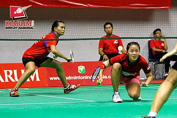 Chintia Rhizta/Ristya Ayu (PB Djarum) menyambut pengembalian dari Sellawaty Tanurijaya/Shinta Dwi (Exist).