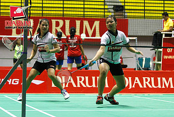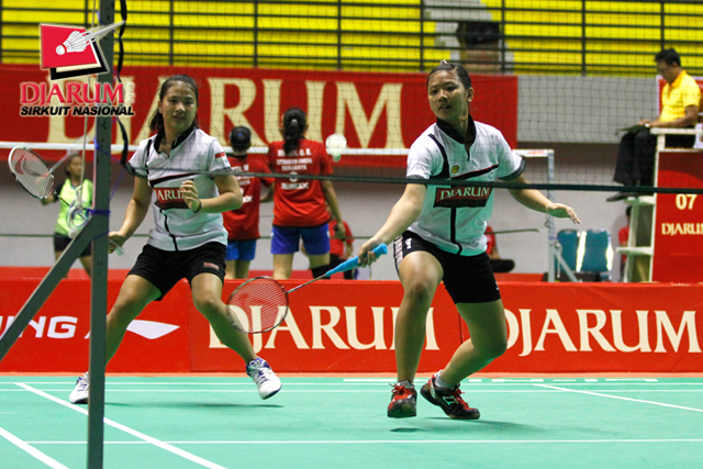 Deariska Putri/Nurbeta Kwanrico (PB Djarum) mengembalikan shuttlecock ke arah Ni Ketut Mahadewi/Tike Arieda (Jaya Raya Suryanaga).