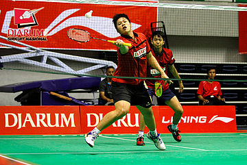 Thalia Clara/Tutut Novi (PB Djarum) bersiap mengembalikan shuttlecock ke arah Iryan Atika/Wulan Mulia (PBSI Kota Yogyakarta).