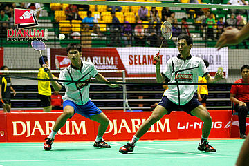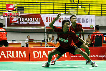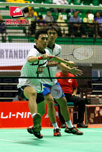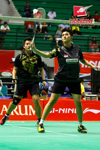 Kenas Adi/Rangga Yave (PB Djarum) mengembalikan shuttlecock ke arah Rendra Wijaya/Rian Sukmawan (Musica Champion).