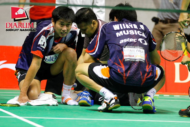 Atlet ganda dewasa putra asal Musica Champion, Rian Sukmawan (kiri) saat mendapatkan penanganan medis di sela-sela pertandingan.