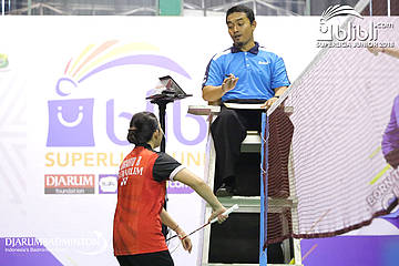 Ribka Sugiarto (PB. DJARUM) memprotes hasil keputusan wasit