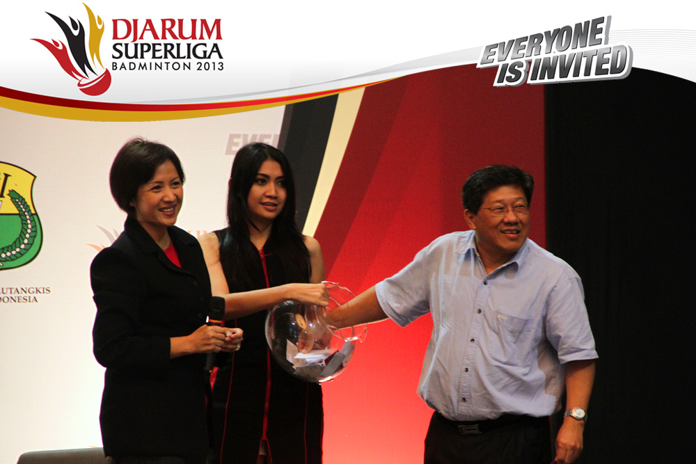 Direktur PT Djarum Yan Haryadi sedang mengambil undian doorprize di acara konferensi pers Djarum Superliga Badminton, Rabu (9/1).