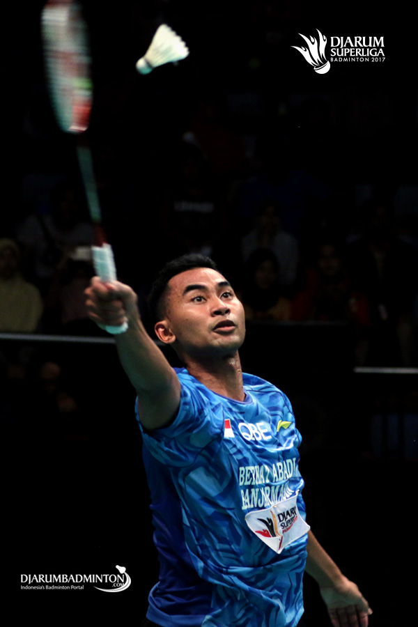 Tommy Sugiarto (PB Berkat Abadi) mengembalikan shuttlecock.