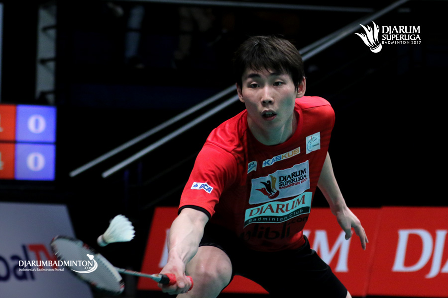 Son Wan Ho (PB Djarum) bersiap menghadang serangan.
